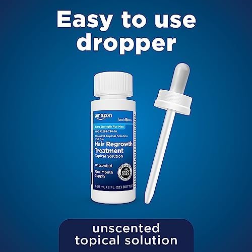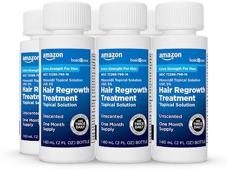 Amazon Basic Care Minoxidil Topical Solution USP, 5 Percent is an extra strength, clinically proven hair regrowth treatment for men experiencing thinning hair. This unscented formula contains the #1 dermatologist-recommended active ingredient and features an easy-to-use dropper for twice-daily application. Compared to leading brands like Rogaine, it offers the same proven results at a more affordable price point.